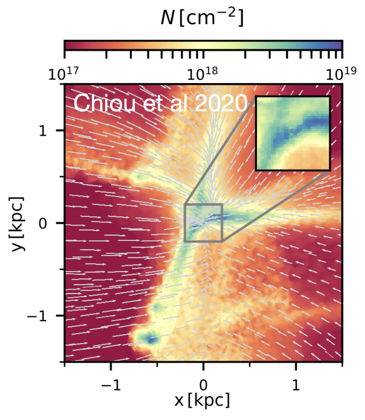 In the Figure to the left, from Chiou et al. (2019), we speculated on how SIGOs and DM/G objects will be observed today. Assuming a burst-like star formation before reionization (z=10), we adopted an initial mass function (IMF) for the objects. In particular, we followed Decressin et al. (2007), and a Salpeter IMF for the DM/G. We calculated the fraction of spectral types of stars that evolve along the main sequence. The majority of the stars that survive to the present day will be G and K type stars, as well as red giants. Given this population, we subtracted their various bolometric corrections. We then roughly estimated each object’s visual bolometric magnitude. We also estimated that the observed stellar cluster that formed within the SIGOs corresponds to the highest density peak. We also over-plotted the region of the parameter space that is associated with GCs (red box) and Andromeda and the Milky Way sub-groups (blue area; McConnachie 2012). Heuristically, the SIGOs are consistent with the absolute visual magnitudes of present-day, local GCs. Although the SIGOS in this simulation only contain primordial gas, we speculated that some self-enrichment or second population-formation mechanism (such as pericenter passage of orbits about the nearest DM halo) may contribute to the nonzero metallicity in metal-poor GCs.