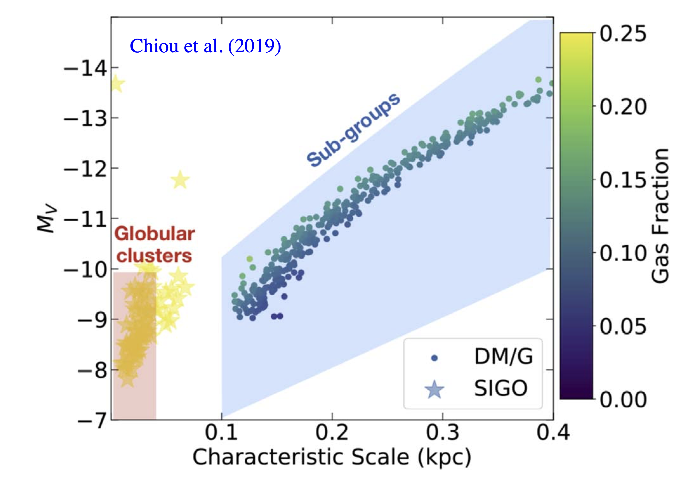 Significantly, Chiou et al. (2019), using numerical simulations, combined with semi-analytical modeling, we showed that the present-day, local, absolute visual magnitude and the SIGOs characteristic scale is consistent with the observed globular cluster population, see Figure. This hints at a possible identification of the SIGOs as the progenitors of present day, low metalicity, globular clusters.